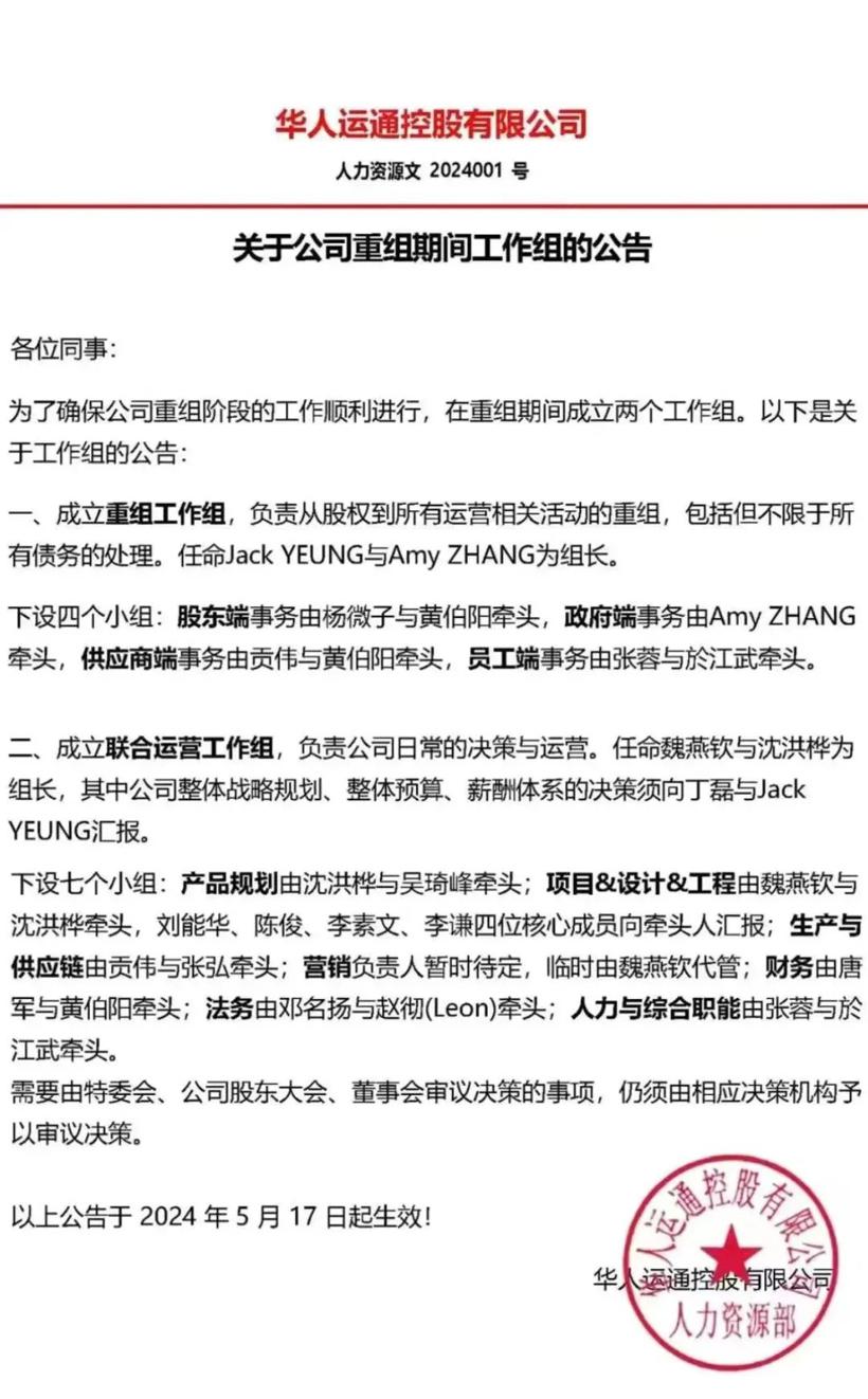 随后,“高合汽车于重组期间筹备工作组”的公告流出,其001编号表明了今年以来第一份官方内部公告的身份,概括了重组的工作通过两个工作组进行分工。