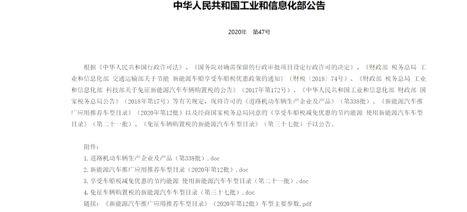 11月30日,中华人民共和国工业和信息化部(以下简称工信部)发布《新能源汽车推广应用推荐车型目录》(2020年第12批)以及经商国家税务总局同意的《享受车船税减免优惠的节约能源 使用新能源汽车车型目录》(第二十一批)、《免征车辆购置税的新能源汽车车型目录》(第三十七批)的公告。