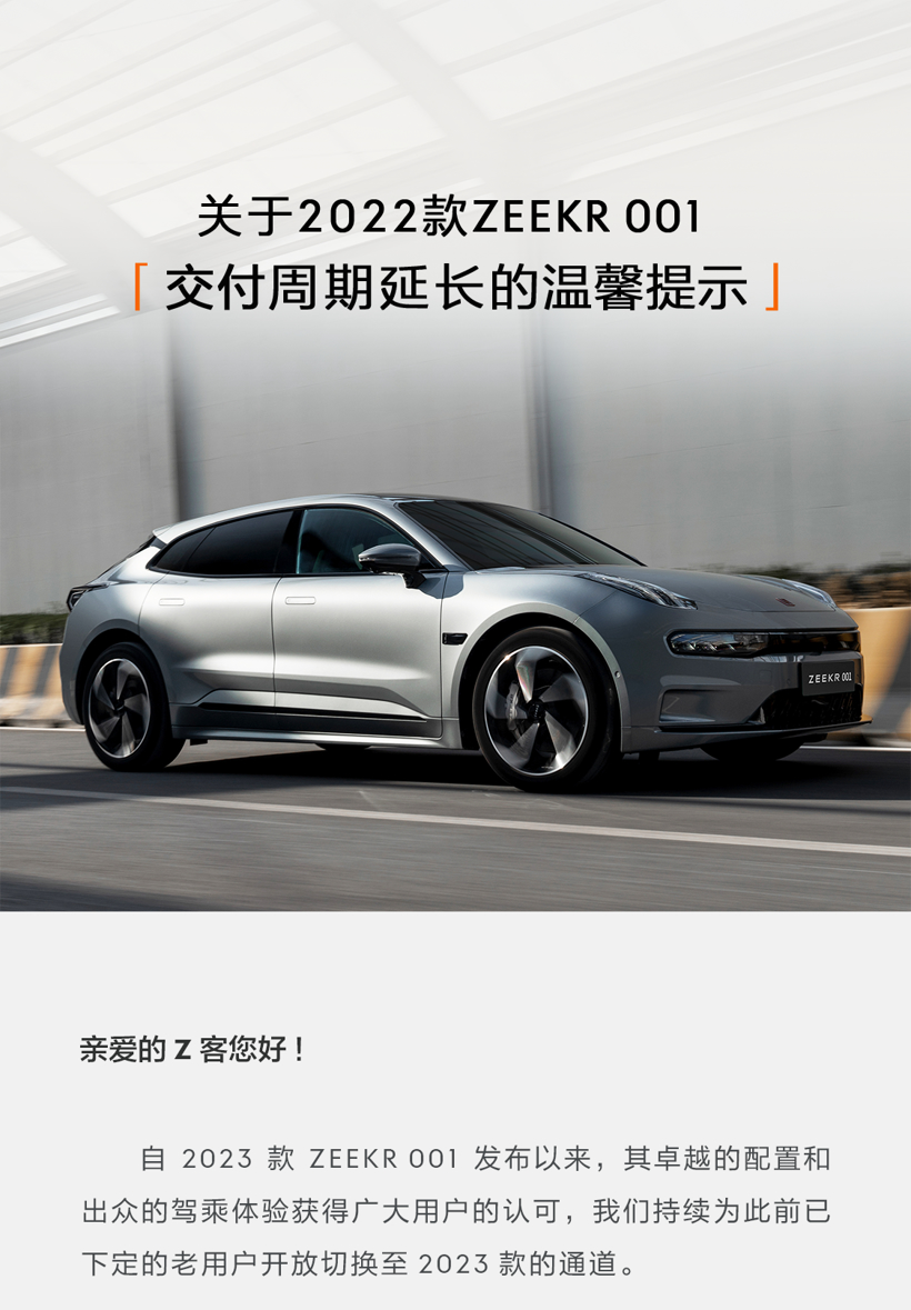 极氪还表明,尊重每一位用户的选择,如果用户希望保留2022款ZEEKR 001的订单,将继续安排车辆生产和交付。同时,为减少交付周期变化给用户带来的影响,为以下用户开启退定通道。