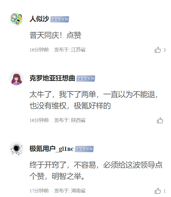 极氪这波允许客户自行退定的操作,目前在新势力品牌中属于首次。因此,消息一发布,许多用户纷纷留言夸赞极氪这一做法,让其赚足了好感度。