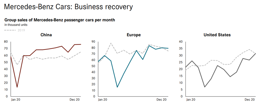 奔驰乘用车部门2020年在中美欧三大市场销量表现(图片来源:戴姆勒)