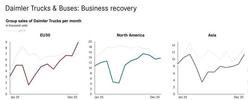 戴姆勒卡客车部门2020年在欧盟30国、北美以及亚洲销量表现(图片来源:戴姆勒)
