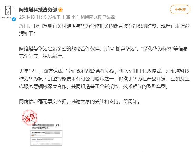 对此,阿维塔法务部表示,阿维塔与华为是最亲密的战略合作伙伴,所谓“抛弃华为”、“淡化华为标签”等信息完全失实,纯属编造。