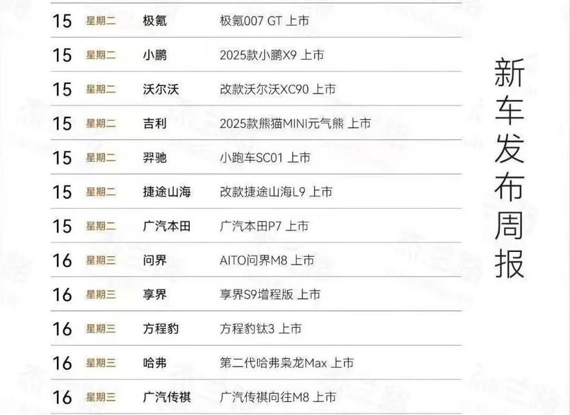 继15号之后,16号也会有5款产品走向市场,问界M8、享界S9增程、方程豹钛3、哈弗枭龙MAX、传祺向往M8等,一款款更加重磅的产品继续投入市场的内卷中去,短短的24小时时间,就有10款重磅产品投向市场。