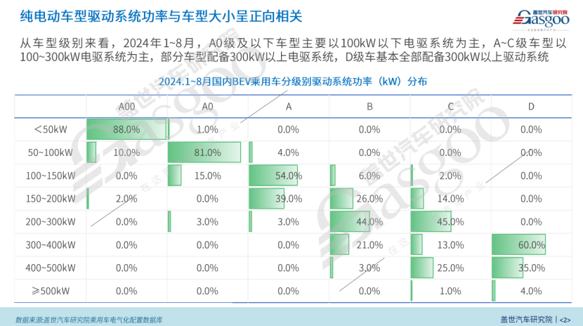 从车型级别来看,纯电动车型驱动系统功率与车型大小呈正向相关。2024年1-8月,A00级车型中,50kW以下的电驱动系统占据了88%的市场份额,反映出该级别车型对低功率电驱系统的偏好。A0级车型主要以100kW以下的电驱系统为主,A-C级车型以100-300kW电驱系统为主,部分车型配备300kW以上电驱系统,D级车基本全部配备300kW以上驱动系统。