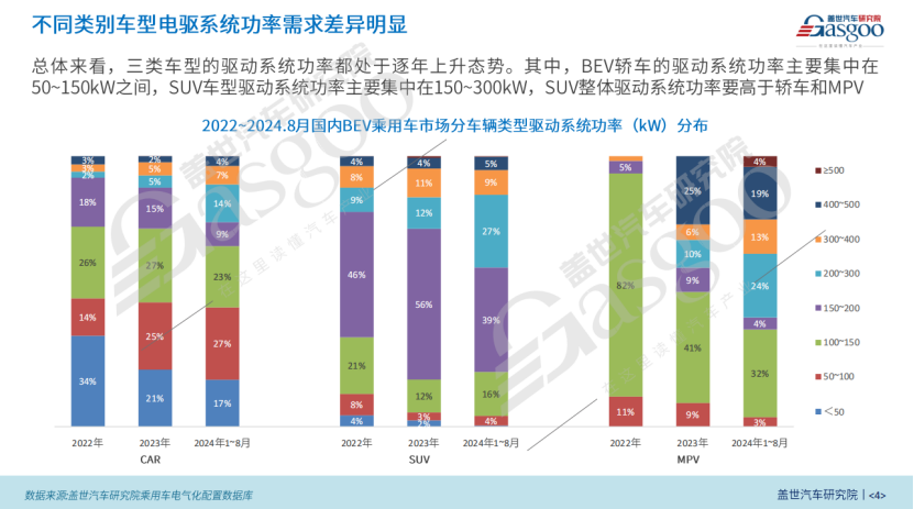 从轿车、SUV、MPV三种不同类别的车型来看,2022年至2024年8月期间,三类车型的驱动系统功率都处于逐年上升态势。其中,BEV轿车的驱动系统功率主要集中在50-150kW之间,并且呈现出逐年上升的态势,市场份额从40%增长至50%。SUV车型驱动系统功率主要集中在150-300kW,这部分市场份额从55%增长至66%。MPV车型驱动系统功率以100-150kW为主,占比32%,其次是200-300kW,占比24%。总体而言,SUV整体驱动系统功率要高于轿车和MPV。