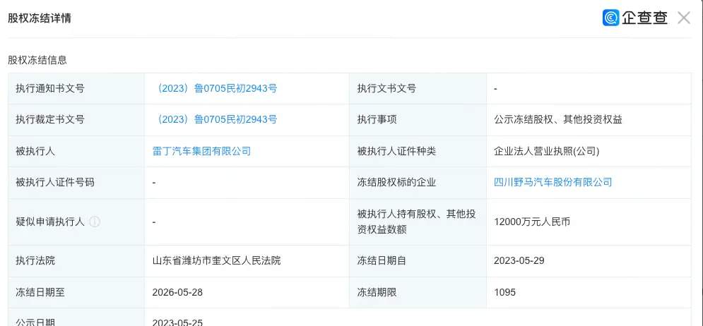 5月30日消息,据企查查App显示,雷丁汽车新增一则股权冻结信息,股权被执行企业为四川野马汽车股份有限公司,冻结股权数额为 1.2 亿元人民币,冻结期限自 2023 年 5 月 29 日至 2026 年 5 月 28 日,执行法院为山东省潍坊市奎文区人民法院,执行事项为公示冻结股权、其他投资权益。