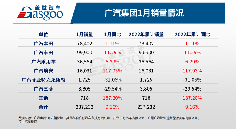 2月8日,广汽集团公布了2022年1月产销数据。该数据显示,其1月汽车产量为21.9万辆,同比增长13.96%;1月汽车销量为23.7万辆,同比增长9.16%。产销量分别以正增长趋势实现开门红,与此同时,广汽集团旗下各大子公司中,除广汽菲克和广汽三菱外,其它子公司1月销量均实现了不同程度的增长,其中,广汽埃安1月销量同比增幅高达117.9%。