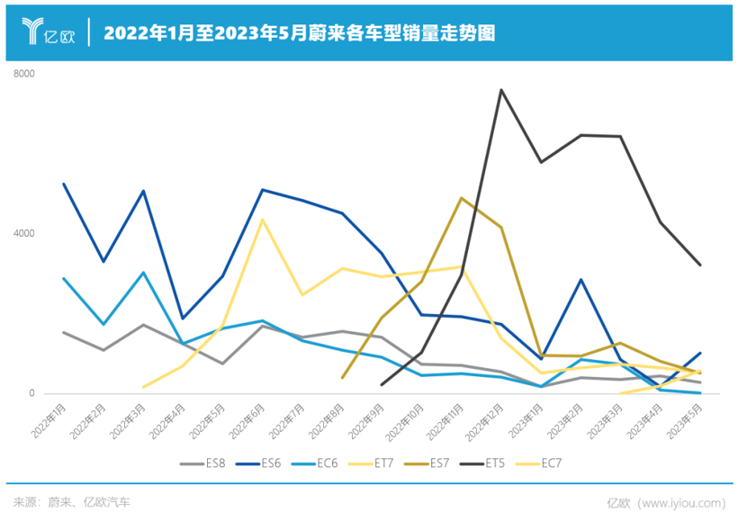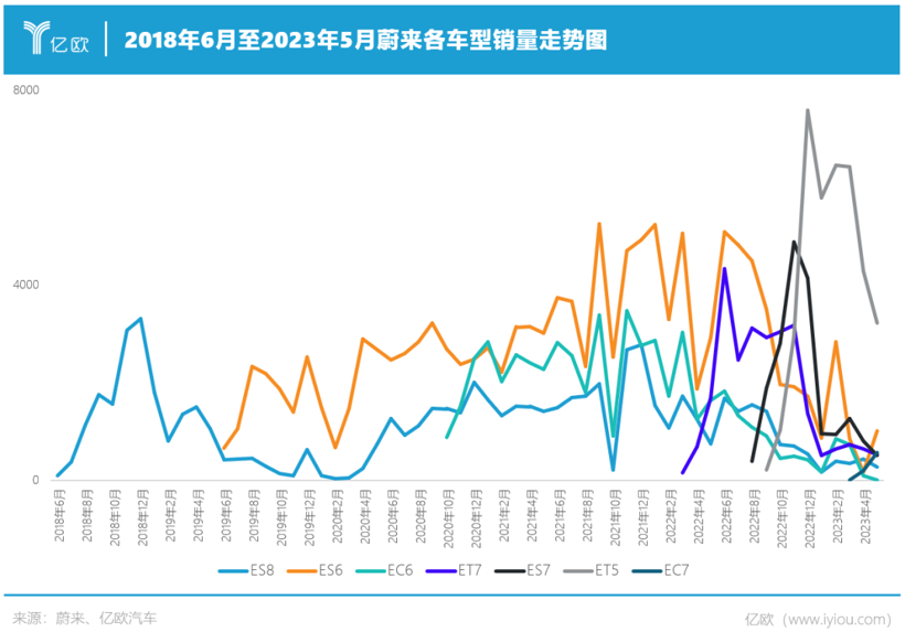 普遍较高的售价也带来了另一个问题,便是蔚来多款车型价格集中在40-60万区间,单款产品价格跨度大以及多款产品价格重合造成内部产品互相挤压,无法有效扩大潜在消费者。这点从蔚来整体销量中也能窥出一二,很多时候一款产品销量的提升会造成其他产品销量下降。