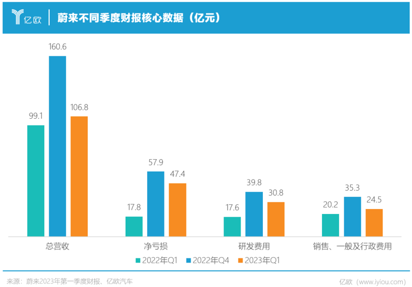 6月9日,蔚来公布了2023年Q1财报,一季度总营收106.8亿元,净亏损47.4亿元,这个数据符合预期的惨淡。