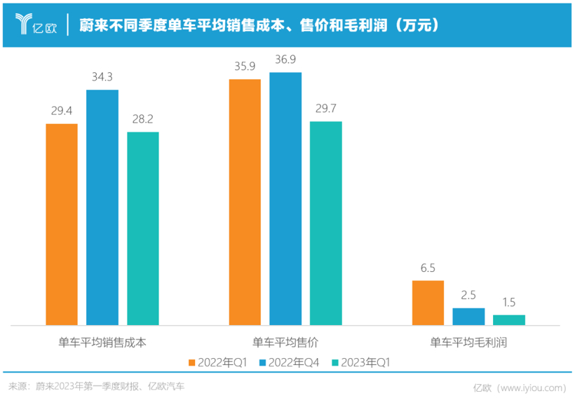 蔚来2022年前三个季度汽车毛利率分别为18.1%、16.7%和16.4%,ET5于2022年9月开始交付后,2022年Q4汽车毛利率便下降到6.8%,2023年Q1毛利率为5.1%,单车平均售价更是下降到29.7万,单车毛利润仅为1.5万元,远低于去年同期的6.5万和去年全年的5.1万元。