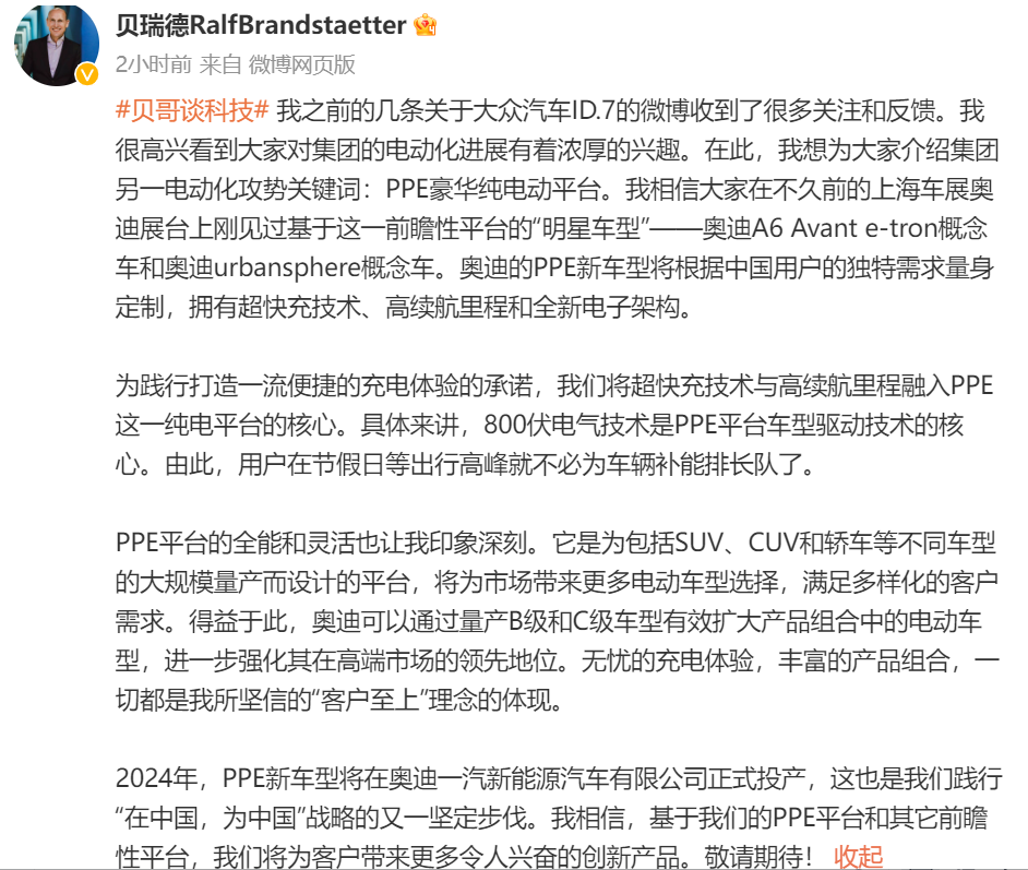 5月30日,大众汽车集团(中国)董事长兼首席执行官贝瑞德在社交媒体上发文称,奥迪的PPE新车型将根据中国用户的独特需求量身定制,拥有超快充技术即、高续航里程和全新电子架构。